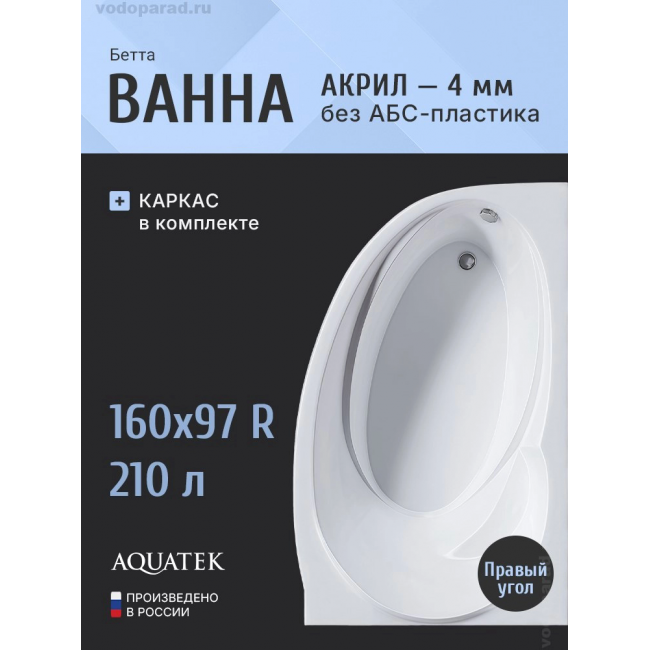 Акриловая ванна АКВАТЕК Бетта 160х97 BET160-0000078 правая, без фронтального экрана, без гидромассажа купить с доставкой. 100% Оригинал. Гарантия!