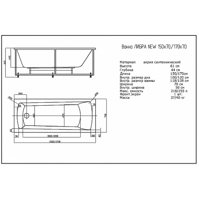 Акриловая ванна Акватек Либра NEW 170х70 LIB170N-0000014 с фронтальным экраном (слив справа) купить с доставкой. 100% Оригинал. Гарантия!