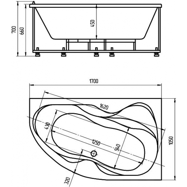 - Ванна устанавливается на каркас, который поставляется в комплекте