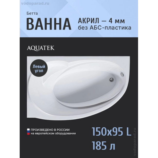Акриловая ванна Aquatek Бетта 150х95 BET150-0000170 левая купить с доставкой. 100% Оригинал. Гарантия!
