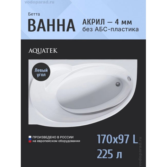 Акриловая ванна Aquatek Бетта 170x97 BET170-0000378 левая купить с доставкой. 100% Оригинал. Гарантия!