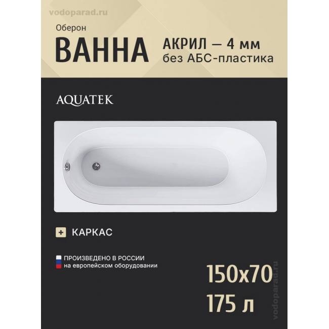 Акриловая ванна Aquatek Оберон 150x70 OBR150-0000003 без фронтального экрана, с каркасом купить с доставкой. 100% Оригинал. Гарантия!
