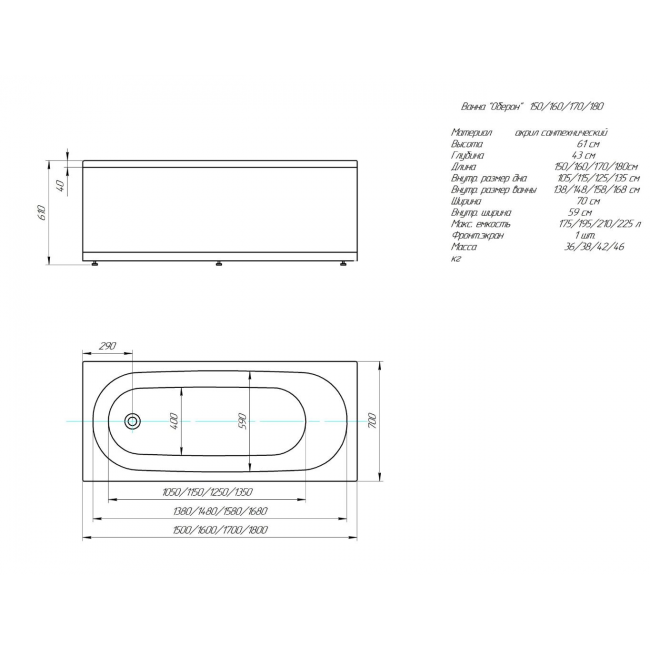Акриловая ванна Aquatek Оберон 150x70 OBR150-0000007 слив справа купить с доставкой. 100% Оригинал. Гарантия!