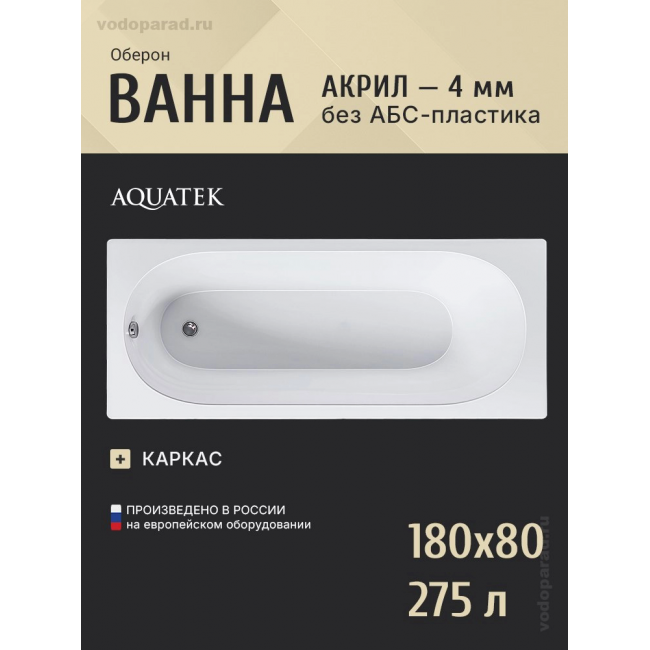 Акриловая ванна Aquatek Оберон 180x80 OBR180-0000008 без гидромассажа, без фронтального экрана купить с доставкой. 100% Оригинал. Гарантия!