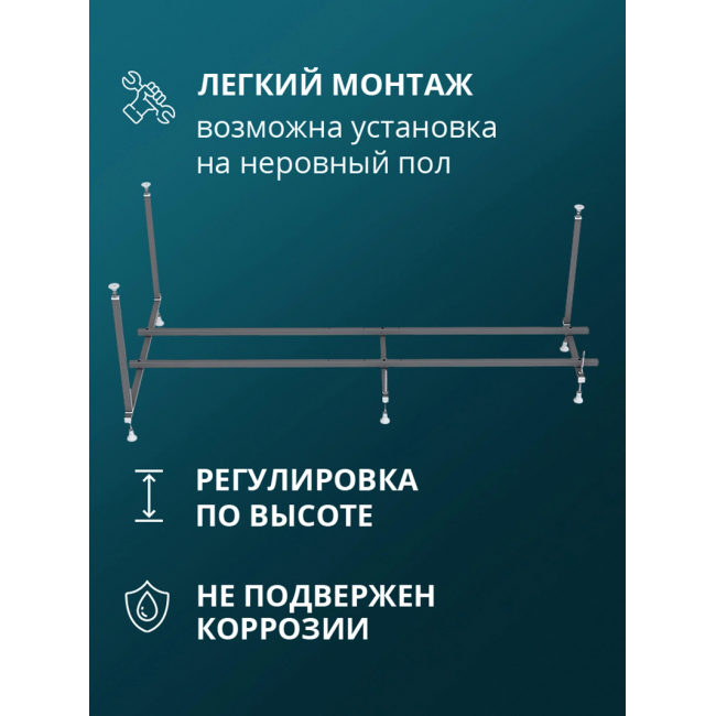 Рамная конструкция обеспечивает надежную поддержку и устойчивость ванны. Опоры по углам придают конструкции жёсткость. Благодаря каркасу акриловая ванна не будет деформироваться и прогибаться. Все это гарантирует ее безопасную эксплуатацию.