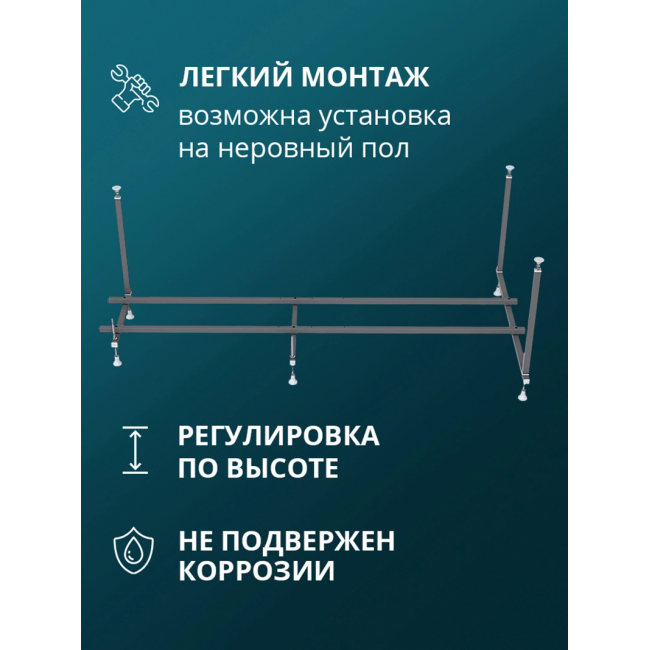 Рамная конструкция обеспечивает надежную поддержку и устойчивость ванны. Опоры по углам придают конструкции жёсткость. Благодаря каркасу акриловая ванна не будет деформироваться и прогибаться. Все это гарантирует ее безопасную эксплуатацию.