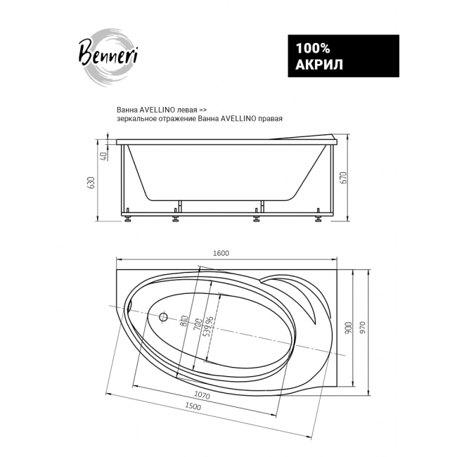 Акриловая ванна Benneri Avellino 160x97 BE.AV160L.01 левая купить с доставкой. 100% Оригинал. Гарантия!