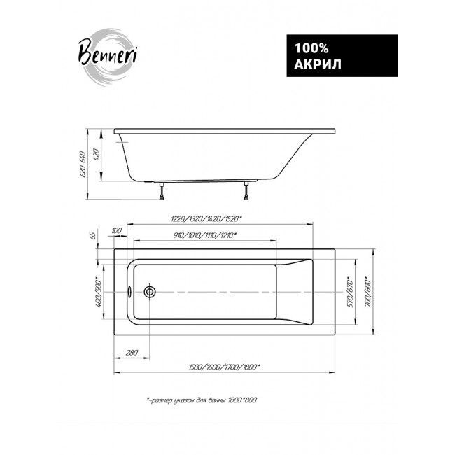 Акриловая ванна Benneri Como 180x80 BE.Co180.01.UK.SL.ch прямоугольная купить с доставкой. 100% Оригинал. Гарантия!