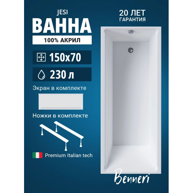 Акриловая ванна Benneri Jesi 150x70 BE.Jes150.01.UK.FP прямоугольная купить с доставкой. 100% Оригинал. Гарантия!