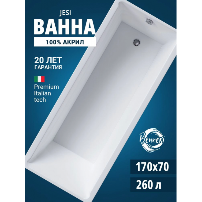 Акриловая ванна Benneri Jesi 170x70 BE.Jes170.01 прямоугольная купить с доставкой. 100% Оригинал. Гарантия!
