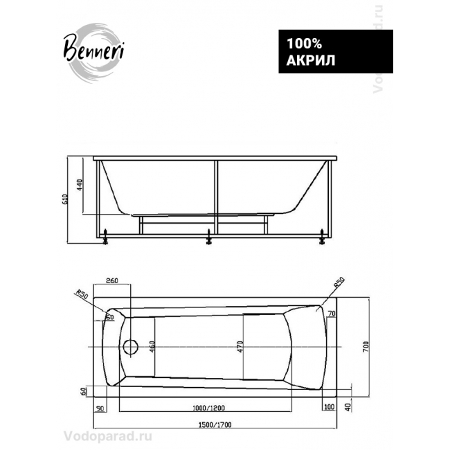 Акриловая ванна Benneri Livorno 150x70 BE.Li150.UK.FP.SL.ch прямоугольная купить с доставкой. 100% Оригинал. Гарантия!