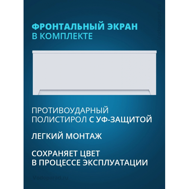 Ванна поставляется в комплекте с фронтальной панелью. Фронтальный экран придает ванне Benneri завершенный вид, закрывает инженерные коммуникации. Экран изготовлен из высокопрочного противоударный полистирола с УФ-защитой. Легкий в уходе, сохраняет белизну на протяжении всего срока эксплуатации.