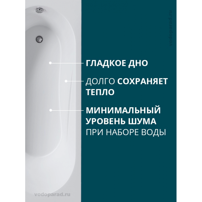 Материал ванны - 100% литьевой сантехнический акрил. Дно ванны усилено закладной из ДСП, дополнительное армирование жестким полеуретаном. Акрил - экологически чистый антибактериальный материал, не впитывает грязь, сохраняет первоначальную белизну и легко моется. Акрил не подвержен деформации, обладает высокой прочностью. При необходимости - легко реставрируется. Акриловая ванна долго сохраняет тепло, обладает минимальным уровнем шума при наборе воды и нескользкой поверхностью. Ножки с регулировкой по высоте позволяют устанавливать ванну на неровный пол. Ножки не подвержены коррозии, выдерживают все заявленные нагрузки, легко и просто устанавливаются. Гарантия на ванну 20 лет, срок службы - не ограничен. Толщина акрила 4 мм. Диаметр отверстий под слив-перелив: 51 мм.