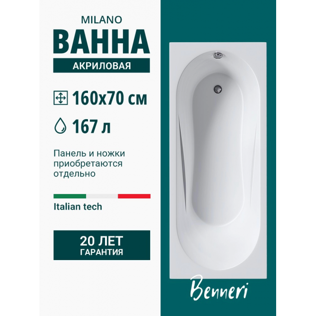 Акриловая ванна Benneri Milano 160x70 BE.Mi160.01 прямоугольная купить с доставкой. 100% Оригинал. Гарантия!