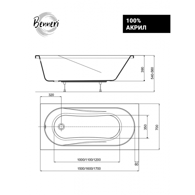 Акриловая ванна Benneri Milano 170x70 BE.Mi170.UK прямоугольная купить с доставкой. 100% Оригинал. Гарантия!