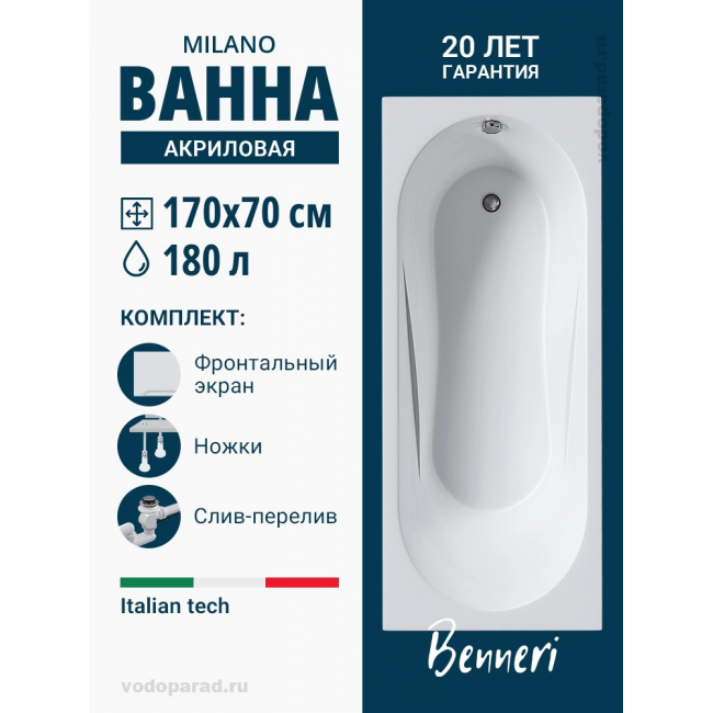 Акриловая ванна Benneri Milano 170x70 BE.Mi170.UK.FP.SL.ch прямоугольная купить с доставкой. 100% Оригинал. Гарантия!