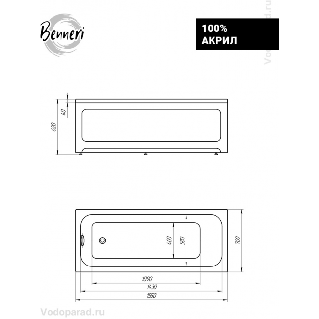 Акриловая ванна Benneri Modena 155x70 BE.Mo155.UK.FP.SL.ch прямоугольная купить с доставкой. 100% Оригинал. Гарантия!