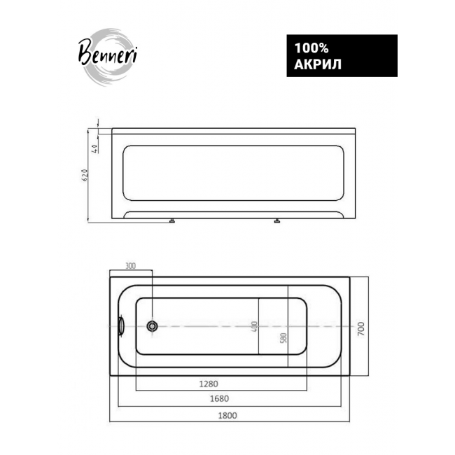 Акриловая ванна Benneri Modena 180x70 BE.Mo18070.UK.FP.SL.ch прямоугольная купить с доставкой. 100% Оригинал. Гарантия!