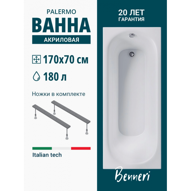 Акриловая ванна Benneri Palermo 170x70 BE.PA170.UK прямоугольная купить с доставкой. 100% Оригинал. Гарантия!