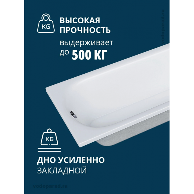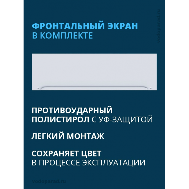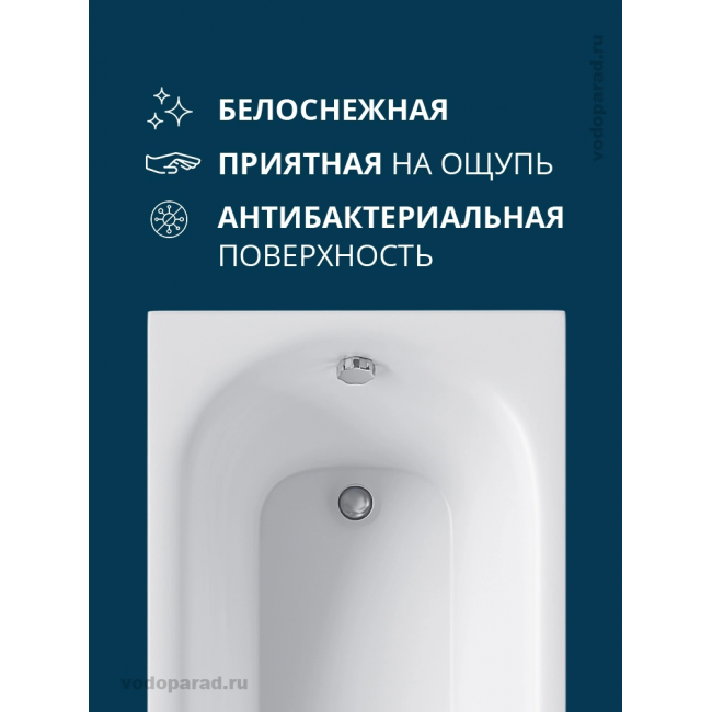 Материал ванны - 100% литьевой сантехнический акрил. Дно ванны усилено закладной из ДСП, дополнительное армирование жестким полеуретаном. Акрил - экологически чистый антибактериальный материал, не впитывает грязь, сохраняет первоначальную белизну и легко моется. Акрил не подвержен деформации, обладает высокой прочностью. При необходимости - легко реставрируется. Акриловая ванна долго сохраняет тепло, обладает минимальным уровнем шума при наборе воды и нескользкой поверхностью. Ножки с регулировкой по высоте позволяют устанавливать ванну на неровный пол. Ножки не подвержены коррозии, выдерживают все заявленные нагрузки, легко и просто устанавливаются. Гарантия на ванну 20 лет, срок службы - не ограничен. Толщина акрила 4 мм. Диаметр отверстий под слив-перелив: 51 мм.