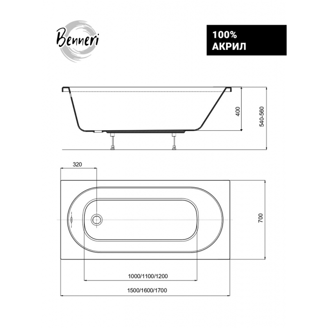 Акриловая ванна Benneri Palermo 170x70 BE.PA170.UK.FP.SL.ch прямоугольная купить с доставкой. 100% Оригинал. Гарантия!