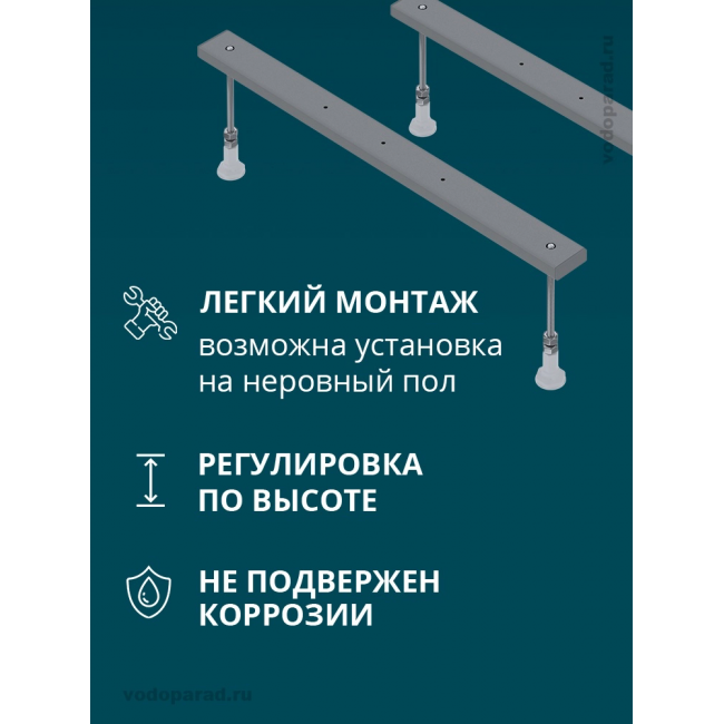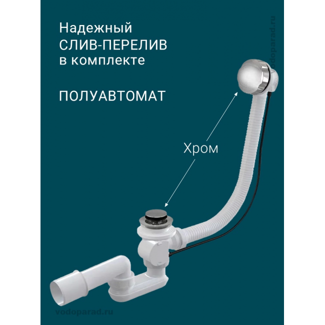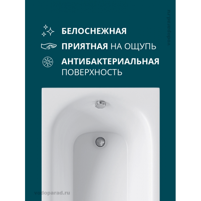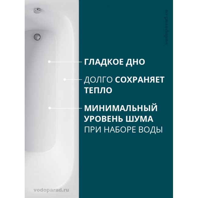 Материал ванны - 100% литьевой сантехнический акрил. Дно ванны усилено закладной из ДСП, дополнительное армирование жестким полеуретаном. Акрил - экологически чистый антибактериальный материал, не впитывает грязь, сохраняет первоначальную белизну и легко моется. Акрил не подвержен деформации, обладает высокой прочностью. При необходимости - легко реставрируется. Акриловая ванна долго сохраняет тепло, обладает минимальным уровнем шума при наборе воды и нескользкой поверхностью. Ножки с регулировкой по высоте позволяют устанавливать ванну на неровный пол. Ножки не подвержены коррозии, выдерживают все заявленные нагрузки, легко и просто устанавливаются. Гарантия на ванну 20 лет, срок службы - не ограничен. Толщина акрила 4 мм. Диаметр отверстий под слив-перелив: 51 мм.