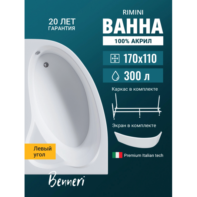 Акриловая ванна Benneri Rimini BE.Ri170L.UK.FP асимметричная купить с доставкой. 100% Оригинал. Гарантия!