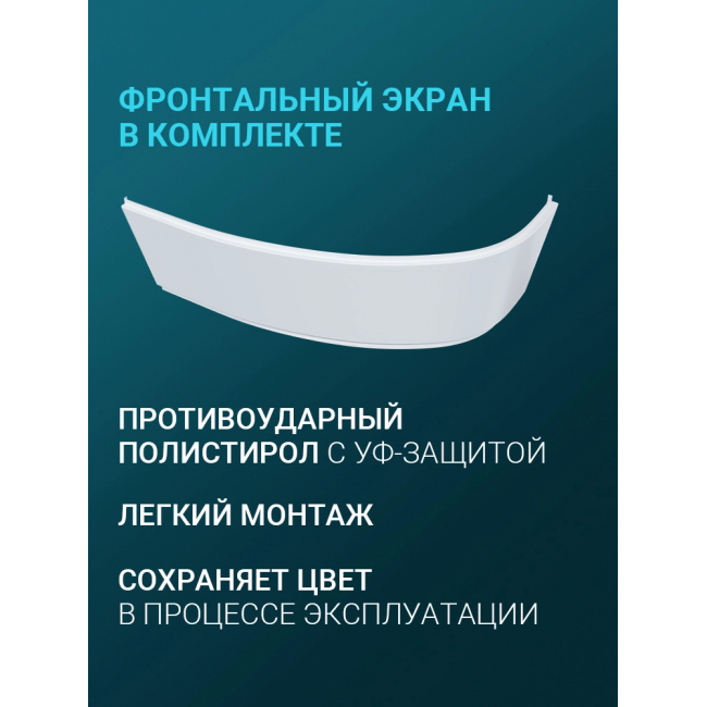 Ванна поставляется в комплекте с фронтальной панелью. Фронтальный экран придает ванне Benneri завершенный вид, закрывает инженерные коммуникации. Экран изготовлен из высокопрочного противоударный полистирола с УФ-защитой. Легкий в уходе, сохраняет белизну на протяжении всего срока эксплуатации.