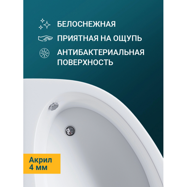 Материал ванны - 100% литьевой сантехнический акрил. Дно ванны усилено закладной из ДСП, дополнительное армирование жестким полиуретаном. Акрил - экологически чистый антибактериальный материал, не впитывает грязь, сохраняет первоначальную белизну и легко моется. Акрил не подвержен деформации, обладает высокой прочностью. При необходимости - легко реставрируется. Акриловая ванна долго сохраняет тепло, обладает минимальным уровнем шума при наборе воды и нескользкой поверхностью.