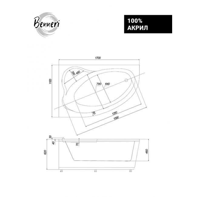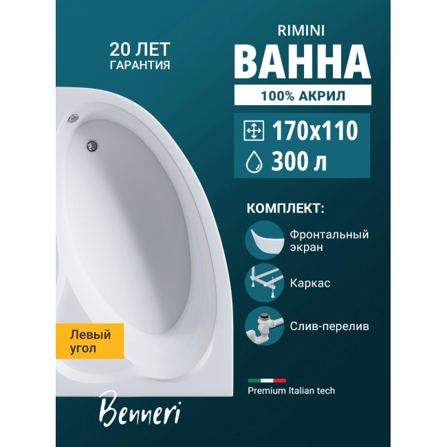 Акриловая ванна Benneri Rimini BE.Ri170L.UK.FP.SL.ch асимметричная купить с доставкой. 100% Оригинал. Гарантия!