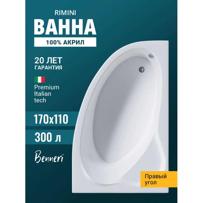 Акриловая ванна Benneri Rimini BE.Ri170R.01 асимметричная купить с доставкой. 100% Оригинал. Гарантия!