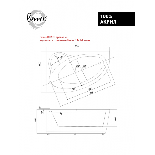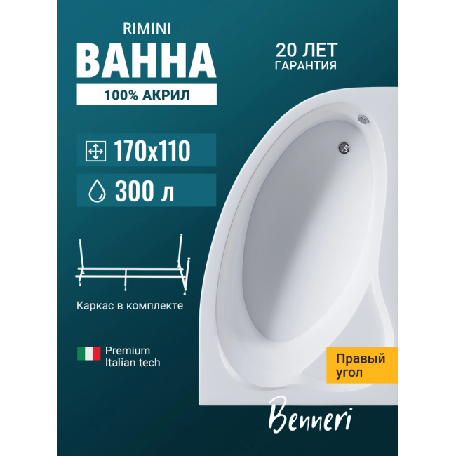 Акриловая ванна Benneri Rimini BE.Ri170R.UK асимметричная купить с доставкой. 100% Оригинал. Гарантия!