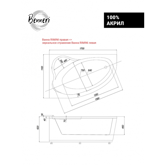 Акриловая ванна Benneri Rimini BE.Ri170R.UK.FP.SL.ch асимметричная купить с доставкой. 100% Оригинал. Гарантия!
