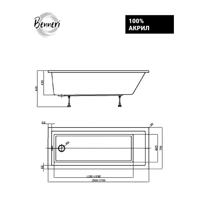 Акриловая ванна Benneri Rovena 150x70 BE.Rov.150.01.UK прямоугольная купить с доставкой. 100% Оригинал. Гарантия!