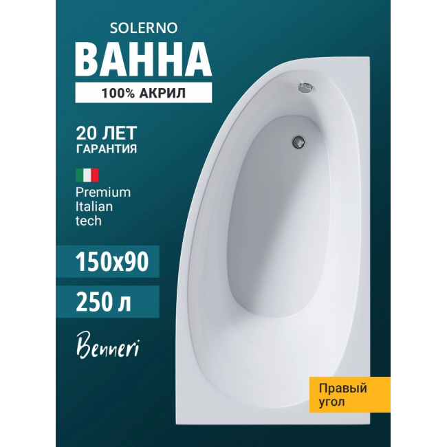 Акриловая ванна Benneri Solerno 150x90 BE.SO150R.01 правая купить с доставкой. 100% Оригинал. Гарантия!