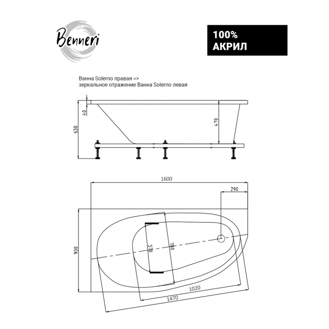Акриловая ванна Benneri Solerno 160x90 BE.SO160R.UK правая купить с доставкой. 100% Оригинал. Гарантия!
