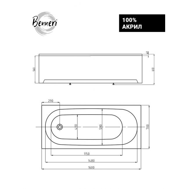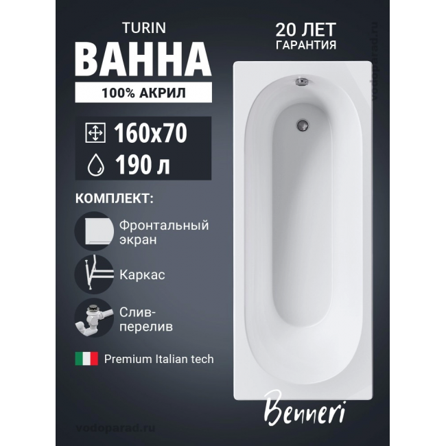 Акриловая ванна Benneri Turin 160х70 BE.Tu160.01.KAR.FP.SL.ch прямоугольная купить с доставкой. 100% Оригинал. Гарантия!