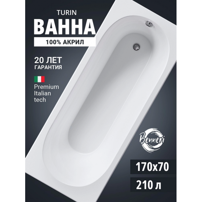 Акриловая ванна Benneri Turin 170х70 BE.Tu170.01 прямоугольная купить с доставкой. 100% Оригинал. Гарантия!