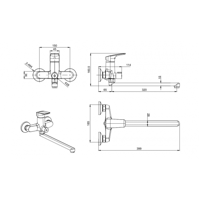 благодаря длинному изливу, возможность использоватьодновременно для ванны и раковины; однорычажная система регулировки силы струи и температуры воды; цельный корпус смесителя снижает вероятность протечек; поворотный переключатель на душ; лейка и шланг в комплект не входят;