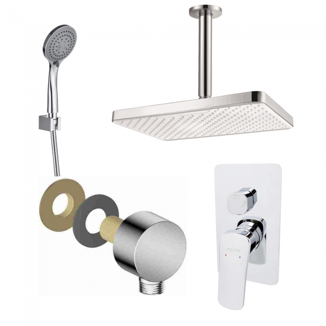 | Комплектация | 1. Смеситель для ванны (внешняя и скрытая часть) 2. Душевой набор 3. Верхний душ потолочный 4. Шланговое подсоединение |