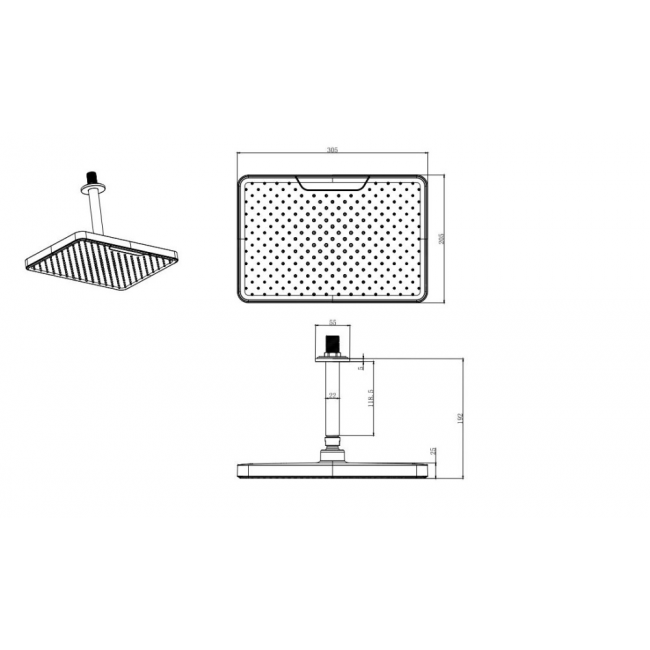 | Комплектация | 1. Смеситель для ванны (внешняя и скрытая часть) 2. Душевой набор 3. Верхний душ потолочный 4. Шланговое подсоединение |