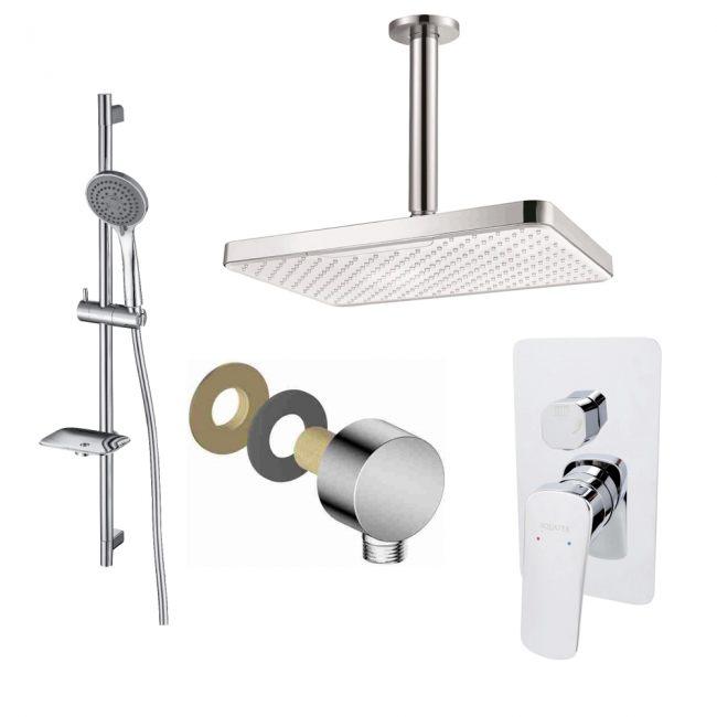 | Комплектация | 1. Смеситель для ванны (внешняя и скрытая часть) 2. Душевой гарнитур 3jet 3. Верхний душ потолочный 4. Шланговое подсоединение |