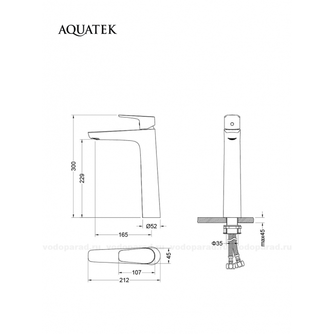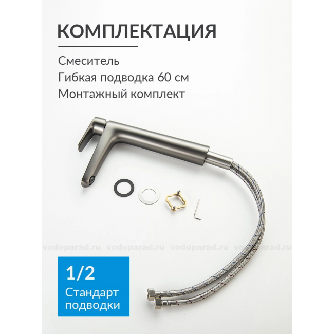 | Комплектация | 1. Смеситель 2. Гибкая подводка 60см 3. Монтажный комплект 4. Слив-перелив и донный клапан в комплект не входят |