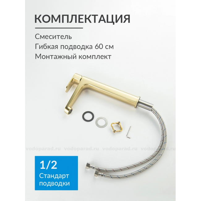 | Комплектация | 1. Смеситель 2. Гибкая подводка 60см 3. Монтажный комплект 4. Слив-перелив и донный клапан в комплект не входят |