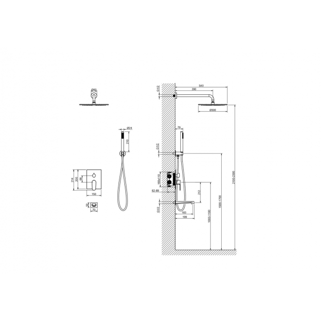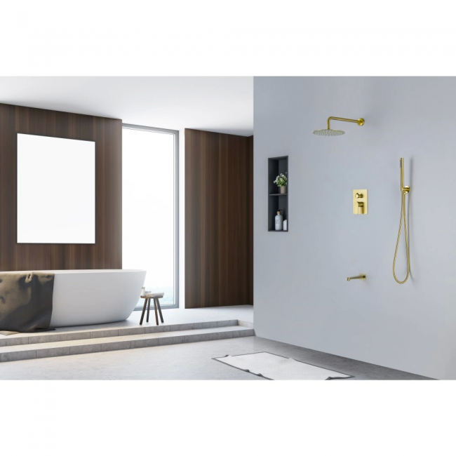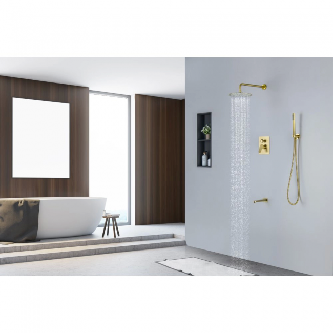| Комплектация | 1. Смеситель из латуни с установочной коробкой на 3 потребителя (внешняя и скрытая часть) 2. Душевой гарнитур: лейка, шланг, шланговое подсоединение с держателем 3. Верхний душ 4. Излив 5. Декоративные накладки на стену из нержавеющей стали 3 мм |
