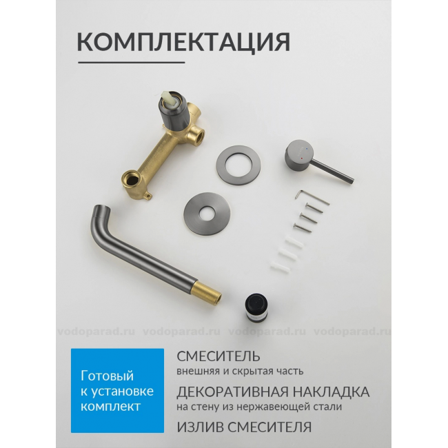 | Комплектация | 1. Смеситель (внешняя и скрытая часть) 2. Декоративная накладка на стену из нержавеющей стали 3 мм 3. Излив смесителя |