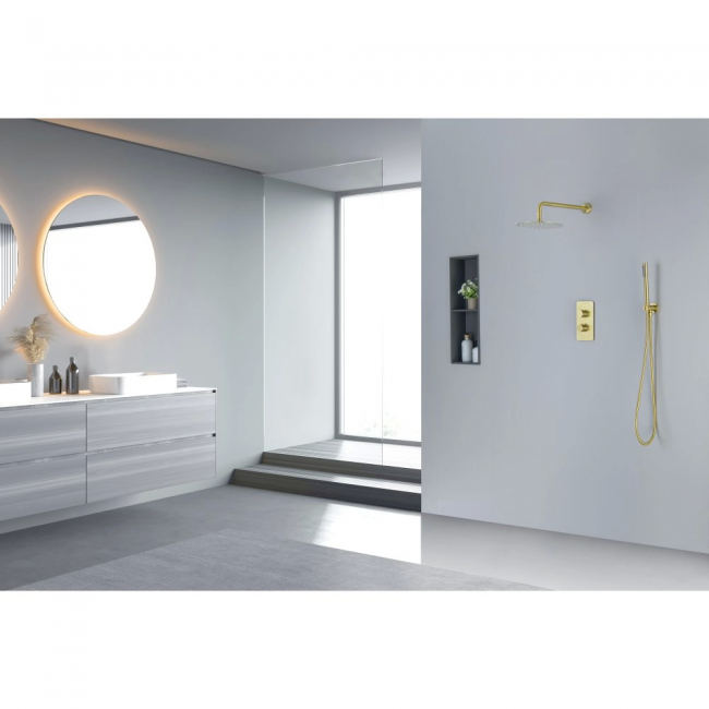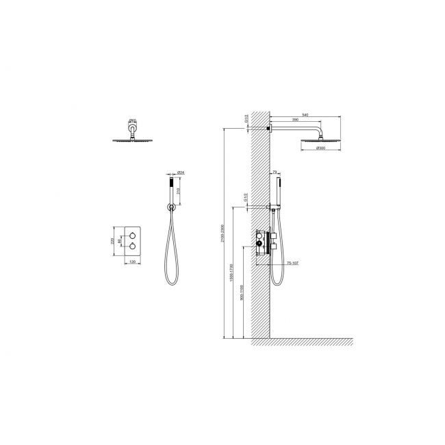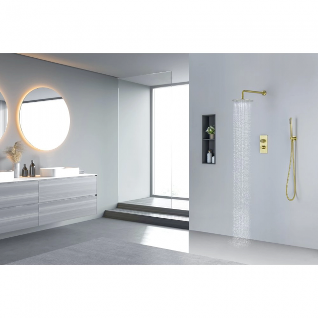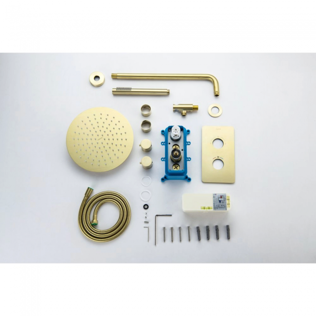 | Комплектация | 1. Смеситель термостатический из латуни на 2 потребителя (внешняя и скрытая часть) 2. Душевой гарнитур: лейка, шланг, шланговое подсоединение с держателем 3. Верхний душ 4. Декоративные накладки на стену из нержавеющей стали 3 мм |