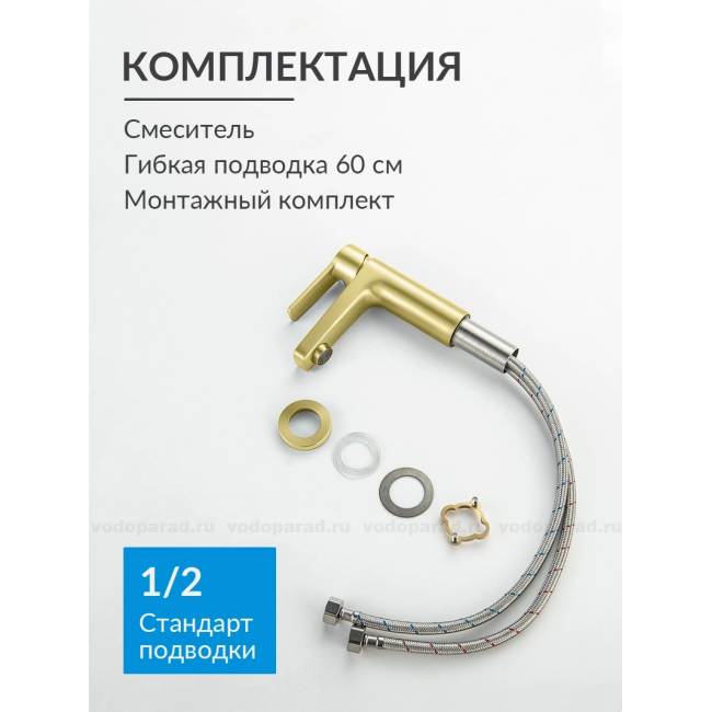 | Комплектация | 1. Смеситель 2. Гибкая подводка 60см 3. Монтажный комплект 4. Слив-перелив и донный клапан в комплект не входят |