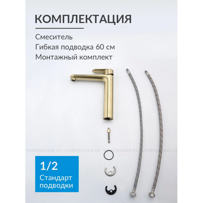 | Комплектация | 1. Смеситель 2. Гибкая подводка 60см 3. Монтажный комплект 4. Слив-перелив и донный клапан в комплект не входят |