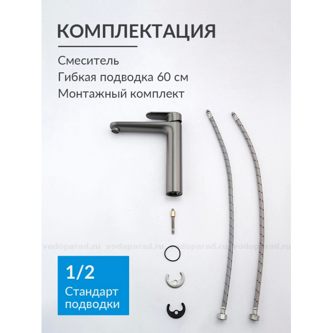 | Комплектация | 1. Смеситель 2. Гибкая подводка 60см 3. Монтажный комплект 4. Слив-перелив и донный клапан в комплект не входят |